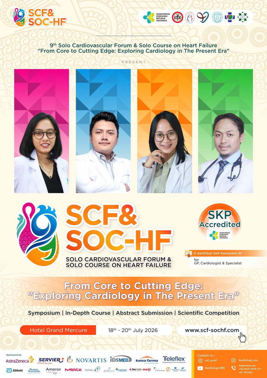 The Department of Cardiology and Vascular Medicine, Faculty of Medicine, Universitas Sebelas Maret (UNS), is delighted to officially present the First Announcement of our most anticipated and prestigious annual scientific gathering: the 9th Solo Cardiology Forum (SCF) & Solo Open Case Heart Failure (SOC-HF). This event has consistently served as a premier platform for knowledge exchange, collaboration, and innovation in the field of cardiovascular medicine. This year, we are excited to bring together esteemed experts, researchers, and healthcare professionals from across the country and beyond to engage in insightful discussions and share the latest advancements in cardiovascular science. Our meticulously curated scientific program covers a diverse array of intriguing and cutting-edge cardiovascular topics. Participants will have the opportunity to take part in comprehensive symposia, specialized in-depth courses, and an exclusive InaHF session, which will delve into critical aspects of heart failure management. Moreover, the event will feature dynamic interactive real-case competitions, allowing participants to analyze and present complex clinical cases, as well as moderated poster sessions and displayed poster presentations, providing a platform for researchers to showcase their latest findings. These sessions aim to foster meaningful academic discussions, encourage knowledge-sharing, and enhance professional networking among attendees. Stay tuned for further details and updates as we prepare for an intellectually stimulating and enriching experience at the 9th SCF & SOC-HF. We warmly invite all cardiovascular professionals, researchers, and enthusiasts to be part of this remarkable scientific journey!